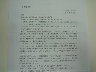なんか言い訳がだらだらと書かれていましたが、事実、私の家族は健康に良いからと何年もエコナを使って天ぷらや揚げ物をしては食べていました。そして相次いで癌の病魔に襲われました。事実関係を証明することはできませんが企業姿勢としてはいかがなものかと強く憤りを感じています。