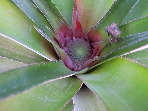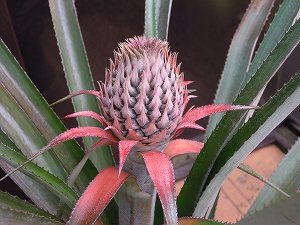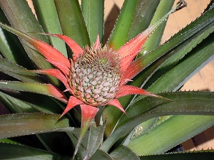 パッションフルーツは簡単なのであたり前のように実がなるのですが、パイナップルとなると茨城県で果実まで収穫させるにはそう簡単なことではありません。それでも2年に1度の割合くらいで実を収穫できるようになりました。今年は特に梅雨明けが早く暑い日が続いたため7月の初めくらいから変化が現れはじめました。