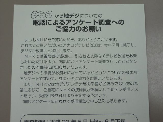 実をいうと、なんと1か月前にあのNHKから地デジについての電話アンケート調査を受けていたんです。アンケートといっても「地デジ対応テレビになっていますか?」という簡単な質問に答えるものでした。