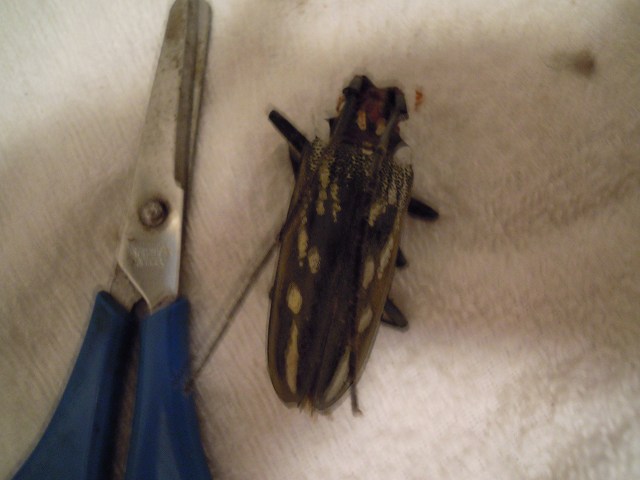 まず大きな“かみきりむし”です。みつけたやつより小型なものは、比較的よくみかけるのですが、こいつは種類が違うようでとっても大きな“かみきりむし”でした。