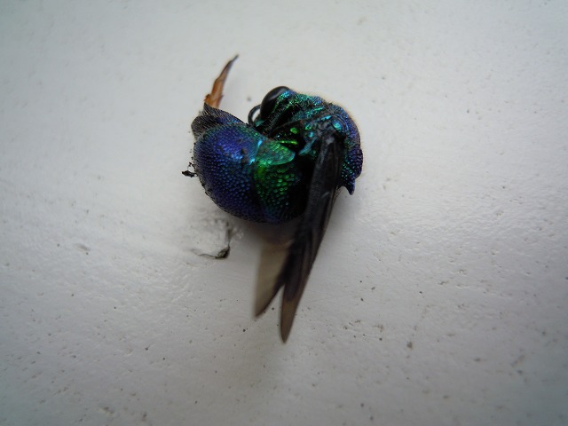 もう一つは、玉虫色をした“蜂?”です。スタッフがわーわーと騒いでいたので、「どうしたの?」と尋ねると「蜂だと思うんですけど、へんなやつなんです」と、私がのぞいてみたら、なるほどおしりから針らしきものを出していて確かに蜂のようでした。