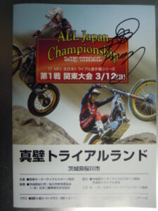 写真は今大会のプログラムで、優勝した黒山選手のサインをもらってあります。黒山選手と言えば世界トライアル選手権の元チャンピオンであり、なんと名前が私と同じなんです。
