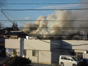 こうなると先程煙っていた場所が火災の現場に違いないと推測でき、くつろいだ格好でサイレンの鳴る方向へ向かい、現場を見通せる窓から目をやると、強い風にあおられた煙が建物から勢い良く立ち上がる光景が目に入りました。