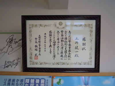 これも警察歯科医を拝命し、本当に僅かながらも警察業務に協力してきたことが評価されたのだと思っております。
