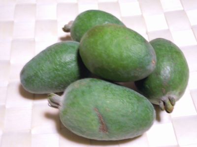 私もいくつか珍しい果実を目撃してきましたが、この果実を見かけたことは無く、写真にあるように“フェイジョア”という果実なんです。