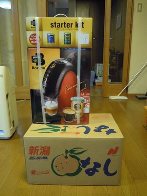 写真にあるように、おいしいコーヒー作成マシーンのバリスタ、そして梨です。