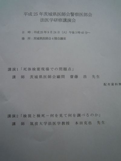 もうすでに、留置人の歯科治療では協力済みですが、今回は“茨城県医師会警察医部会法医学研修講演会”という、舌を咬みそうな長い演題の会合に参加してきました。