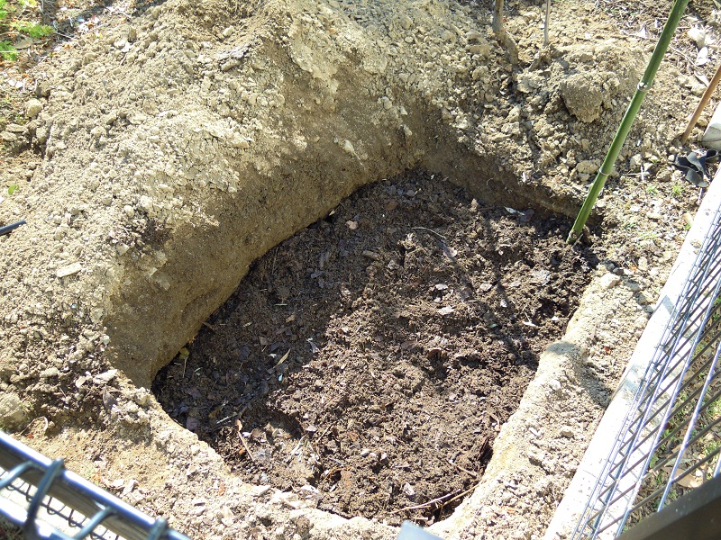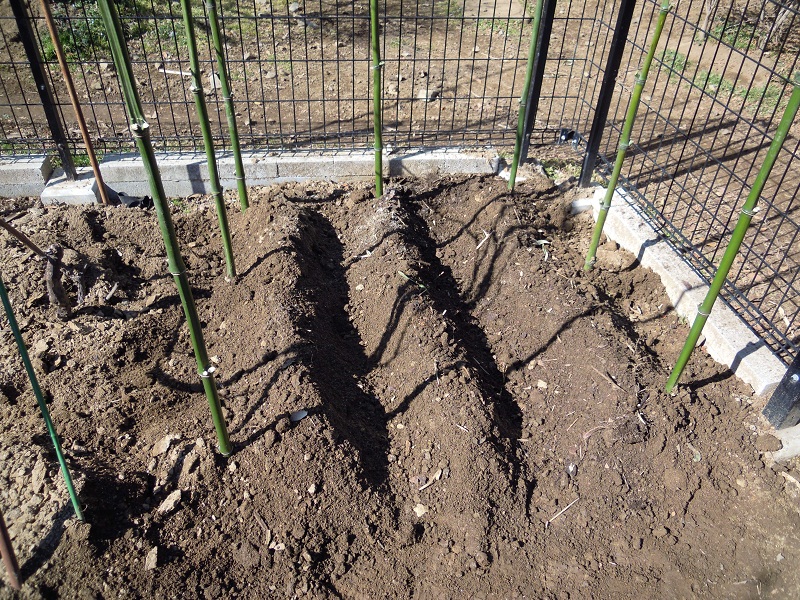 今年はこの区画1メートル四方の改良に取り組みました。主にシャベルで30センチくらいの深さを掘るのですが、前述したようにとても固い土ですぐに手が痛くなるのでほんの僅かしか掘れません。また、掘っても掘ってもガラクタばかりなのでたった1メートル四方でも一苦労なのです。こうして何日もかけて整えた状態がこの写真①です。